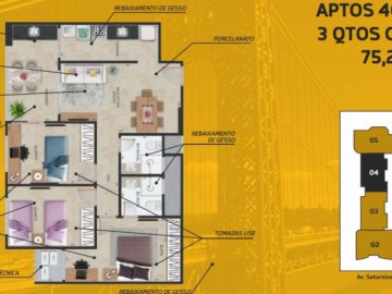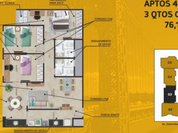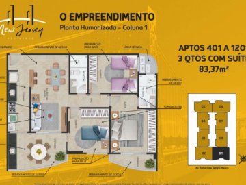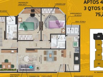 -Tipologia da unidade privativa: Aptos com suíte contendo sala estar/jantar, varanda, cozinha, área de serviço, 03 (três) quartos sendo 01 (um) suíte, banheiro social e área técnica.