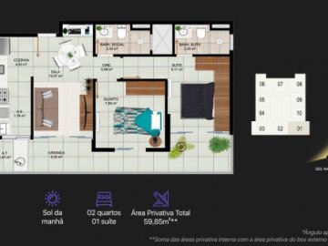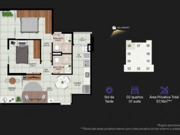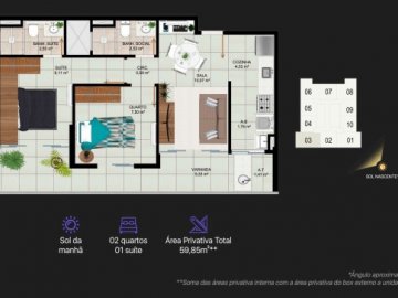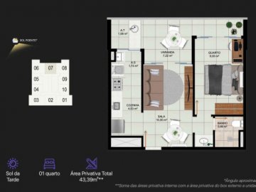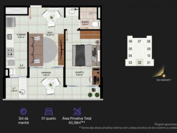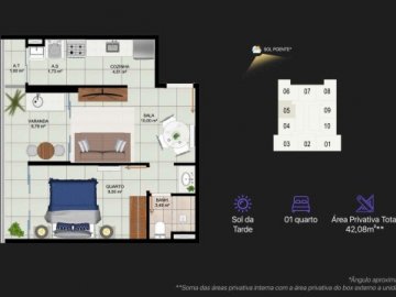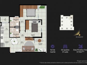 Empreendimento com unidades de 01 Quarto ou 02 Quartos c/ 1 suíte, Sala, Varanda, WC Social, Cozinha e Área de Serviço. 01 vaga de garagem com possibilidade de compra da 2° vaga (moto)