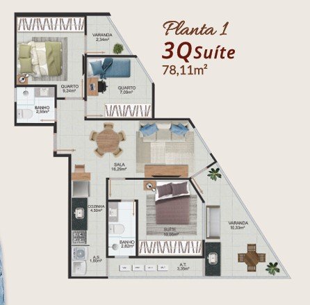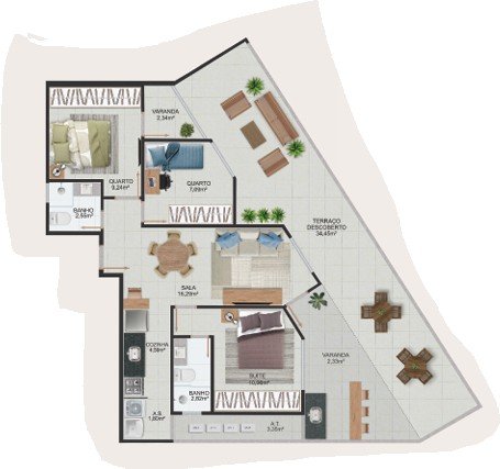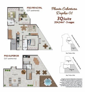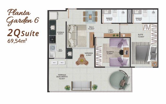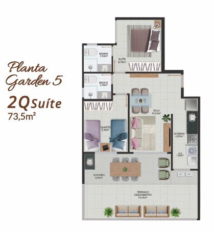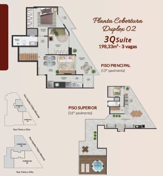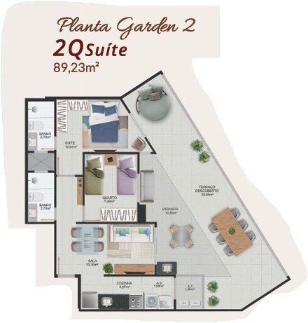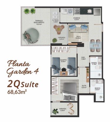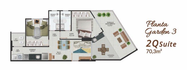 Unidades residenciais de 2 ou 3 Qts c/ suíte, incluindo plantas duplex na cobertura e unidades "Garden", com área externa adicional.