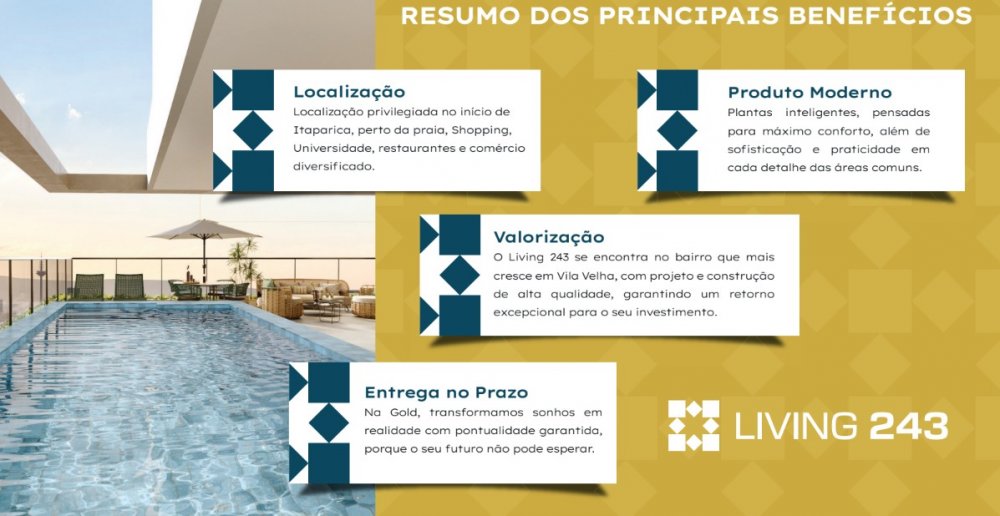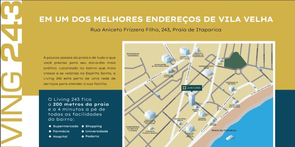 O Living 243 foi projetado com atenção em cada detalhe, pensado para quem valoriza o melhor padrão de vida. Com unidades que oferecem plantas inteligentes, aconchegantes e perfeitamente funcionais, o empreendimento é ideal para um estilo de vida dinâmico. Ele proporciona o equilíbrio perfeito entre aproveitar ao máximo os momentos ao ar livre e desfrutar toda a privacidade e conforto do seu lar.A poucos passos da praia e de tudo o que você precisa para seu dia-a-dia mais prático.