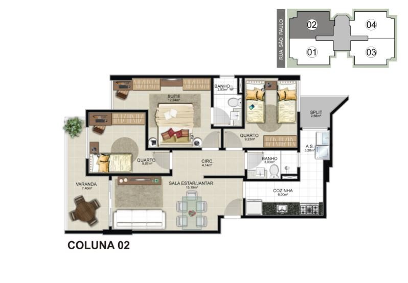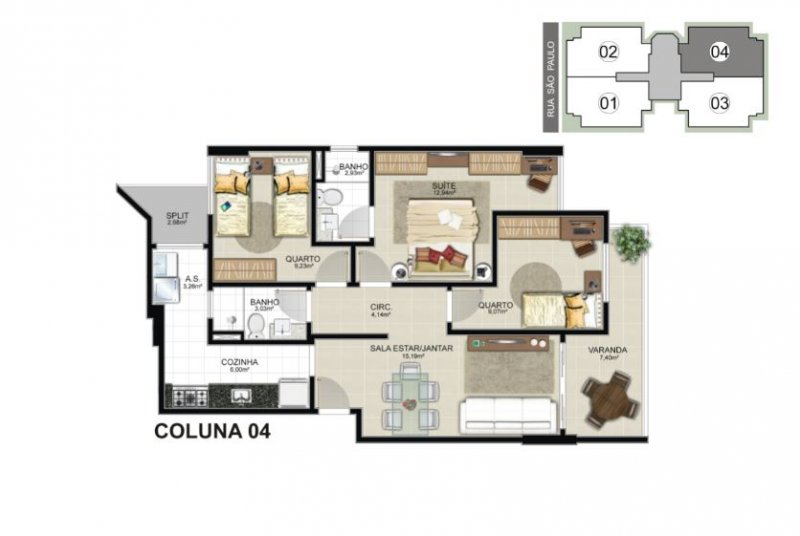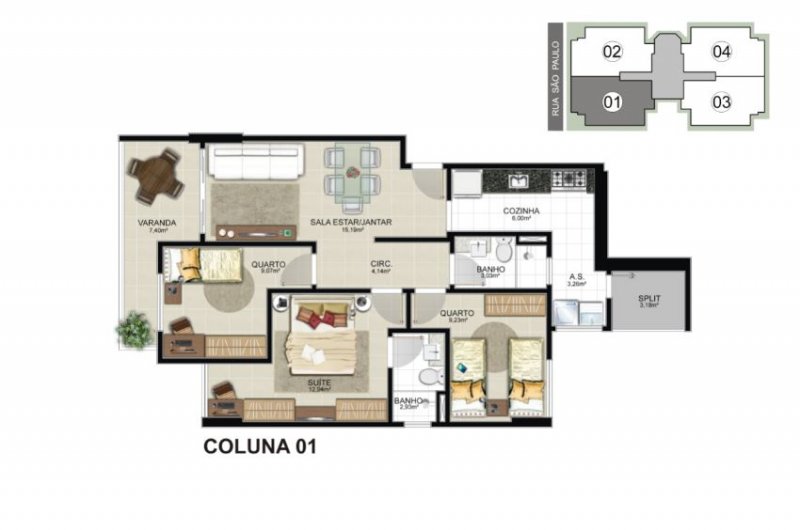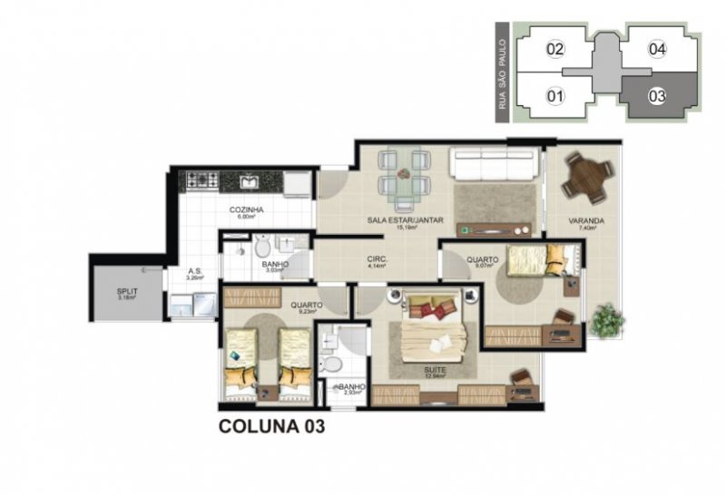 03 quartos com 01 suíte e 02 vagas de garagem. Plantas de 85,58m² e 86,08m² de área privativa.