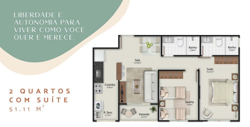 - Área Privativa: 51,11 m²