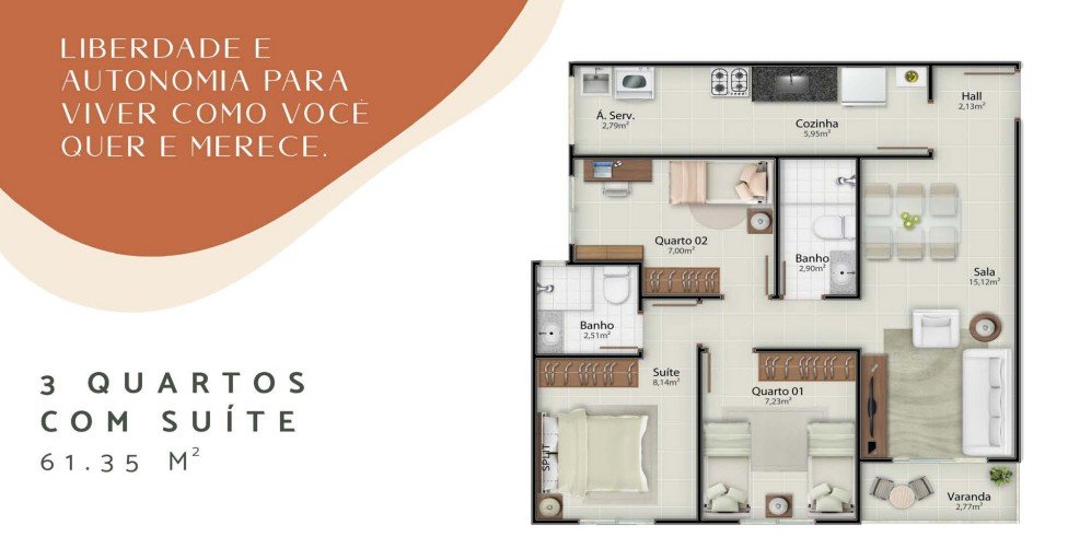 3 QUARTOS COM SUÍTE - 61,35 M²