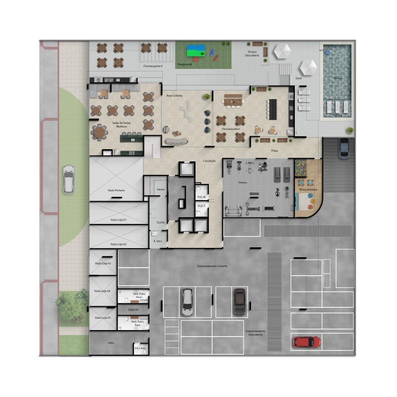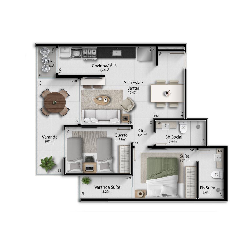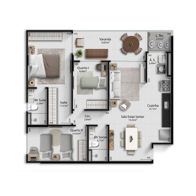 Colunas 07 e 08 - 74,81 m² - 2 quartos c/1 suíte - 1 vg de garagem