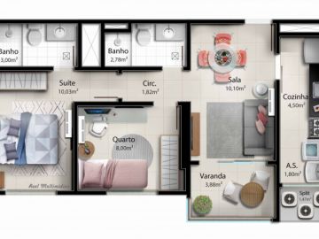 - Banheiros com janela ou ventilação mecânica, paredes todas revestidas e piso em cerâmica
