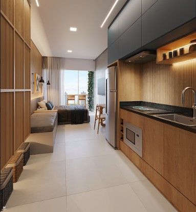 Na Cozinha: marcenaria planejada com móveis instalados na parte superior e inferior da bancada, oferecendo praticidade e aproveitamento de espaço.