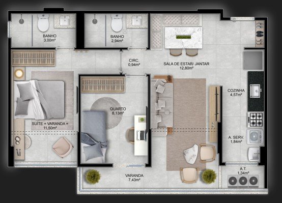O Chroma conta com apartamentos studio a partir de 31,81 m², loft duplex a partir de 42,59 m², 2 quartos com suíte a partir de 62,30 m², e apartamentos garden studio e garden 2 quartos com suíte a partir de 90,14 m² todos com instalações amplas e acabamentos de excelência.