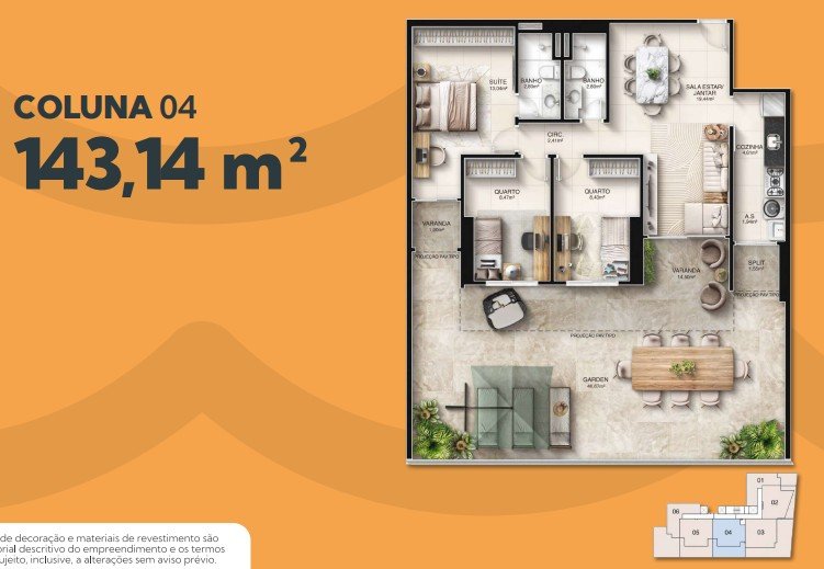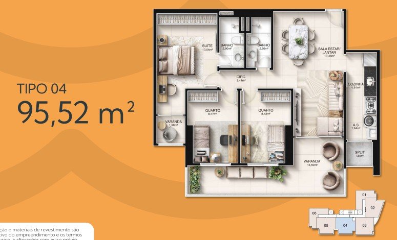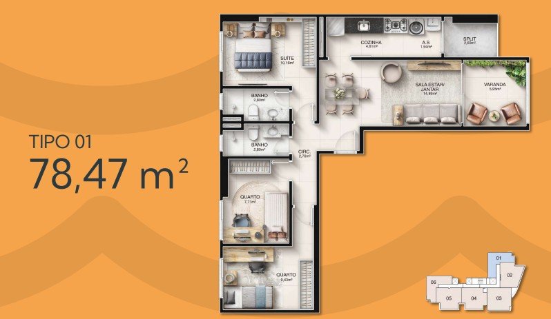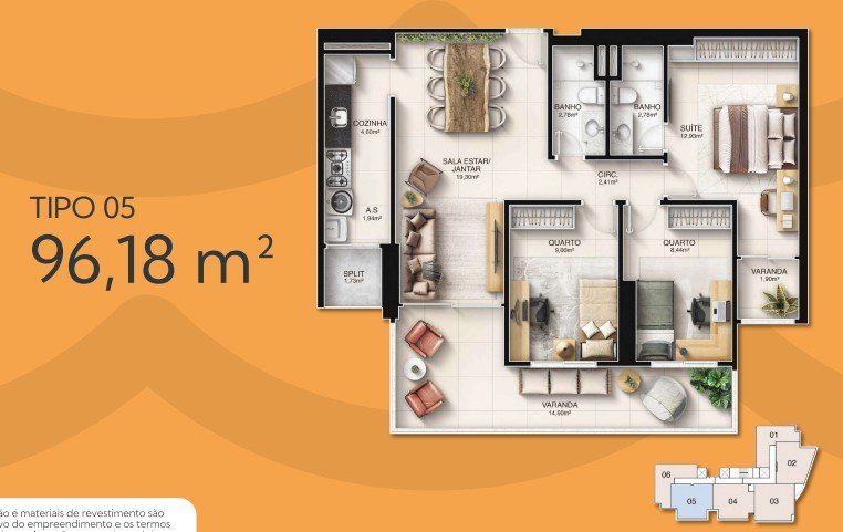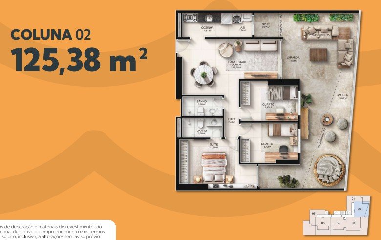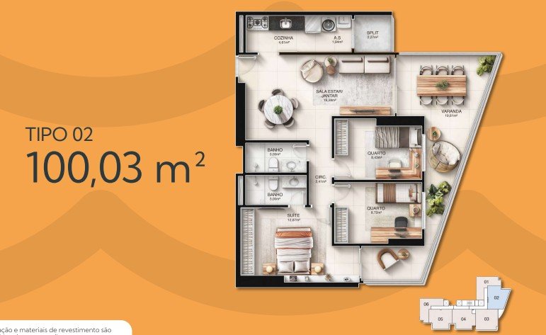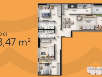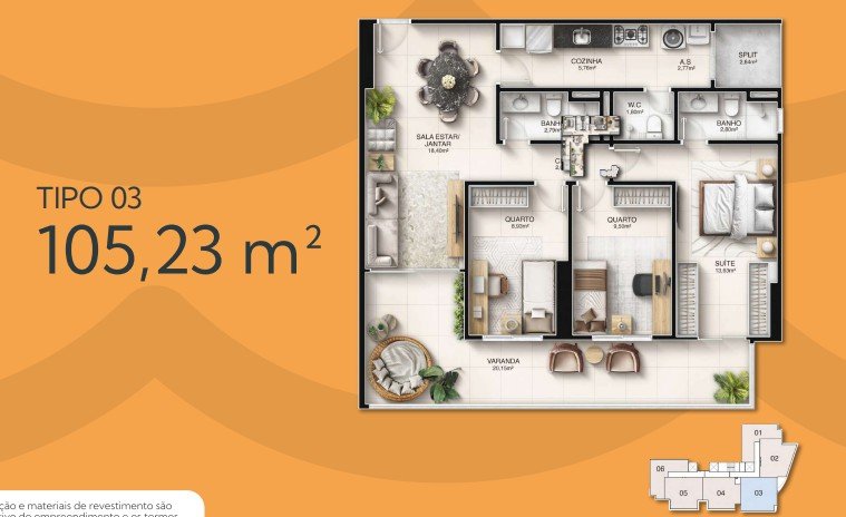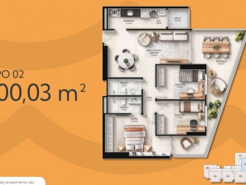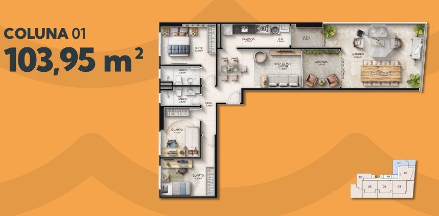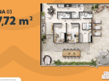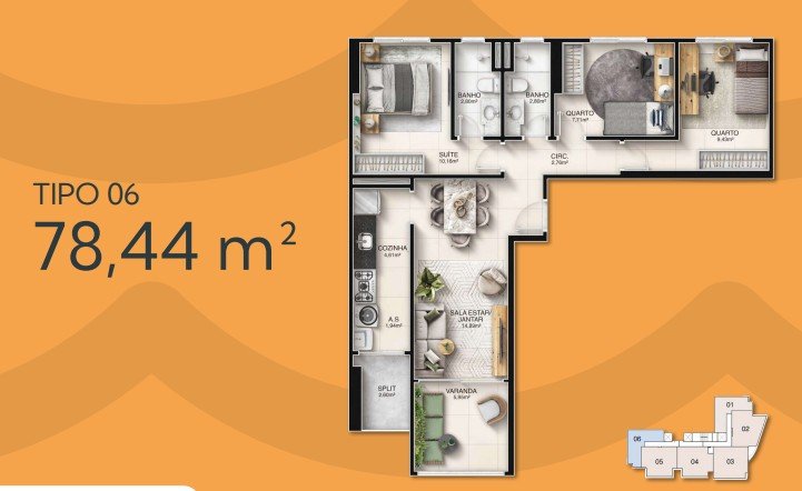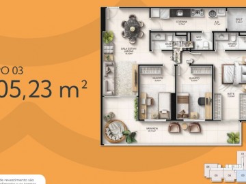 São apartamentos de 03 Quartos, sendo 1 Suíte, 02 Vagas de Garagem. Apartamento com áreas 78,44m² a 105,23m².