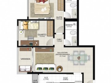 - Piso em porcelanato esmaltado em todos os cômodos, exceto banheiros;