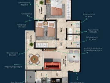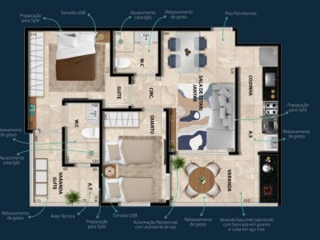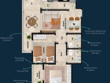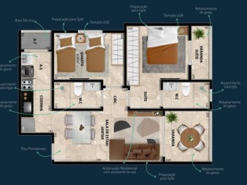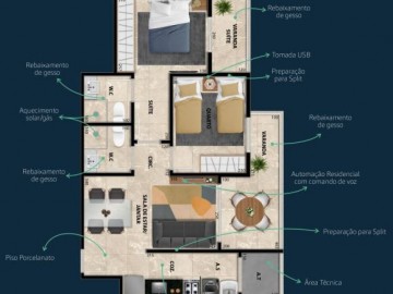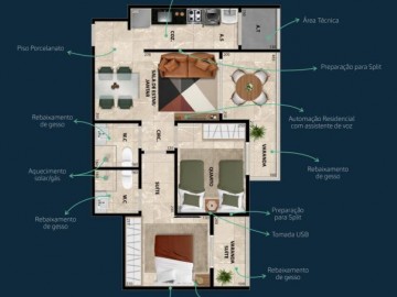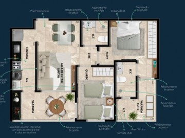 -Aptos de 02 quartos/suíte: Sala de estar/jantar, varanda, cozinha, área de serviço, 02 (dois) quartos sendo 01 (um) suíte, banheiro social e área técnica.