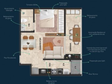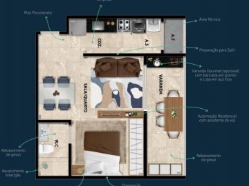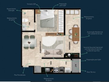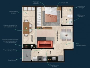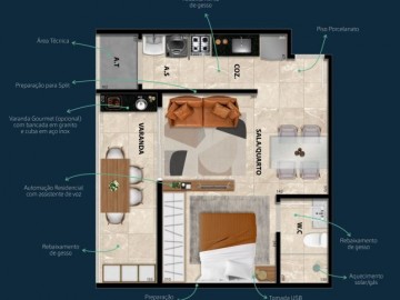 -Aptos de quarto/sala: Sala / quarto, varanda, cozinha, área de serviço, banheiro social e área técnica.-