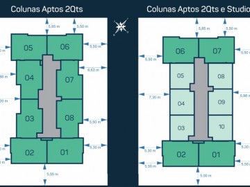 - Coluna 1 Aptos 301 a 701: 64,30m² - Aptos 801 a 1201: 64,23m²