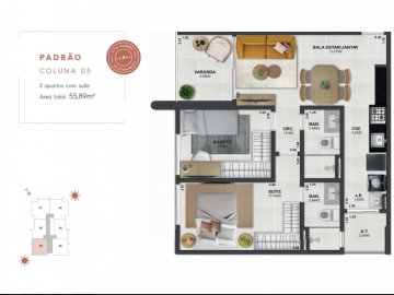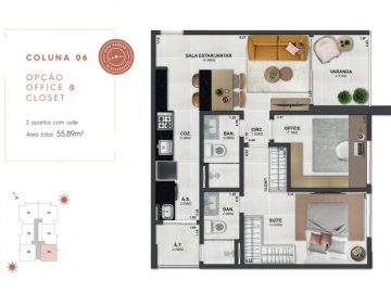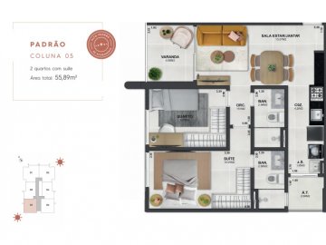 Colunas: 05 e 06: 02 quartos com 01 vaga de garagem - com 55,89 m2 privativos