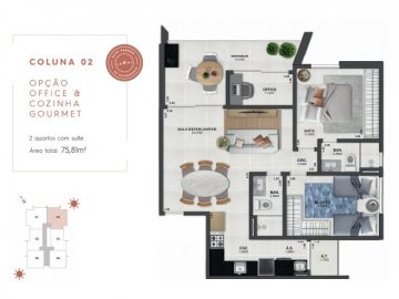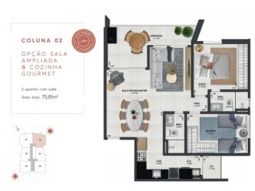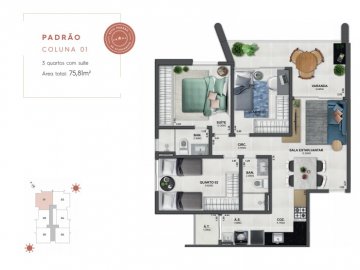 Colunas: 01 e 02: 03 quartos com 02 vagas de garagem - com 75,81 m2 privativos