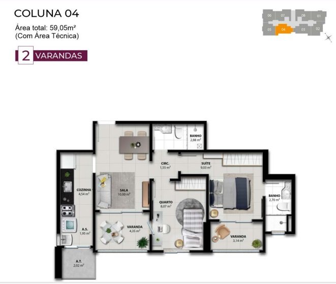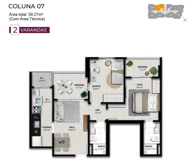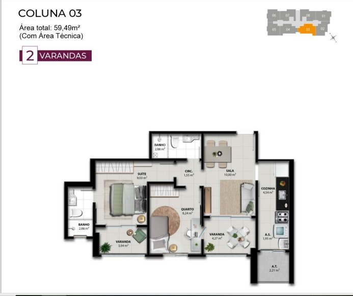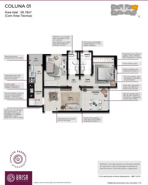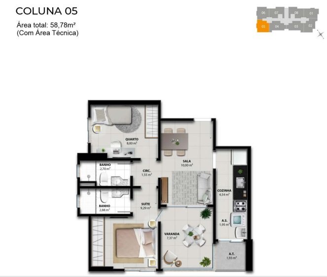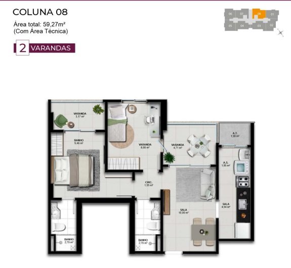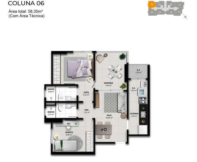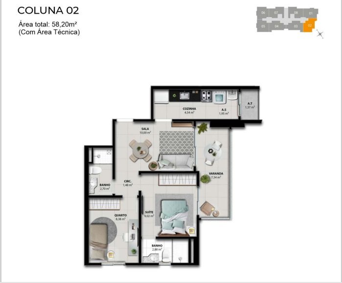 - Área Privativa: 58,37 m²