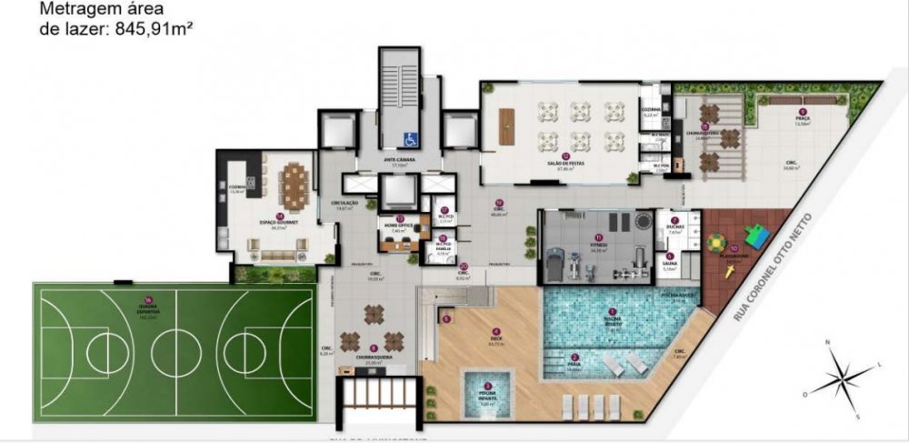 Em uma área de 846 m2 - entregue toda montada e decorada - o empreendimento contará com: