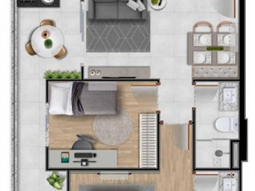 - 02 quartos com 42,40 m2 privativos (o segundo ambiente é multiuso e possui área menor, o que comporta layout de quarto ou escritório)
