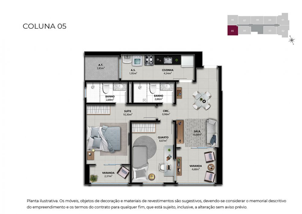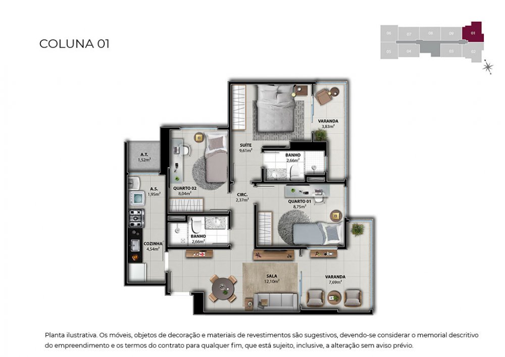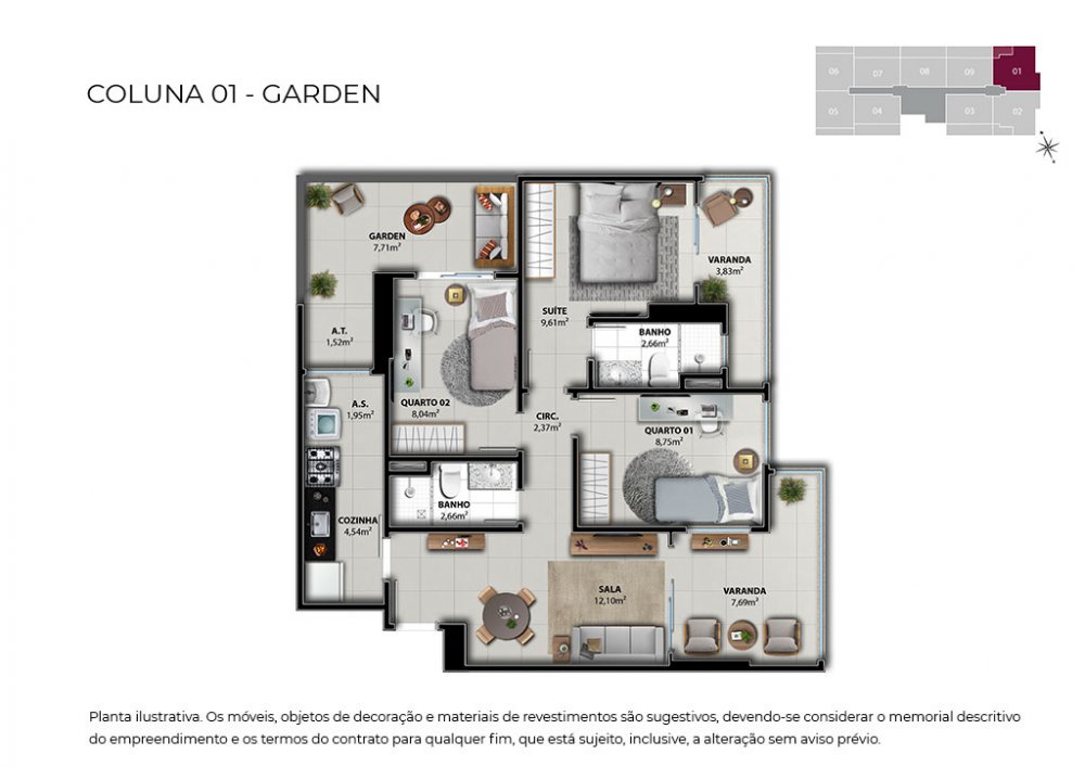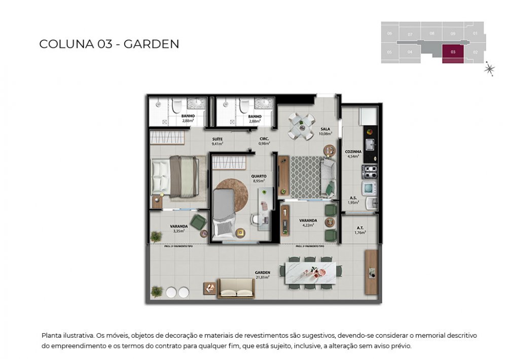 Unidades de 03 quartos com 76,54 m2 - contemplando 02 vagas na garagem.