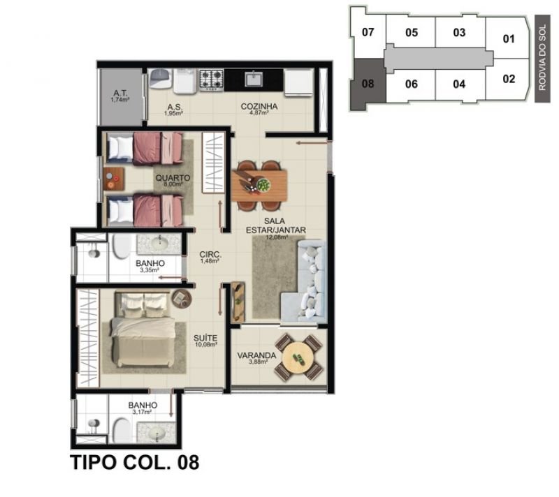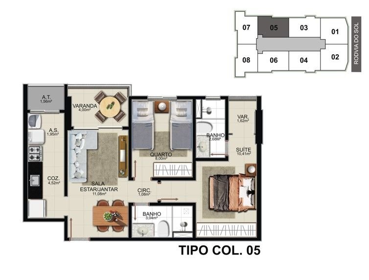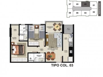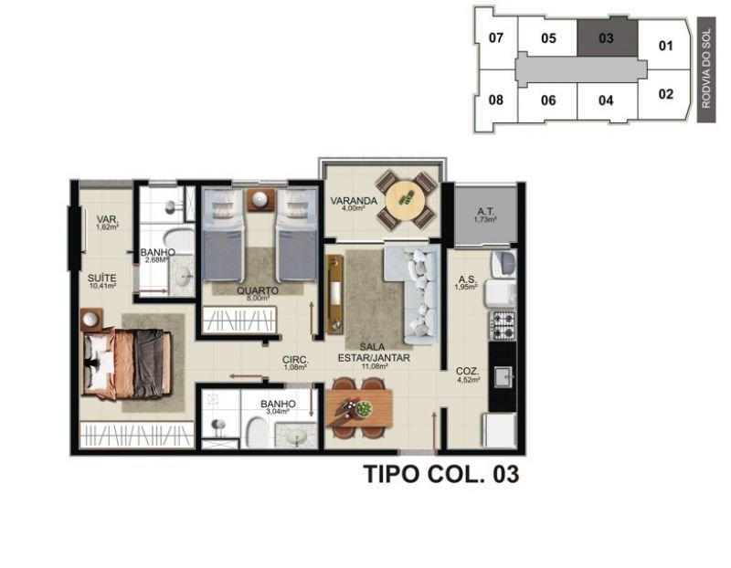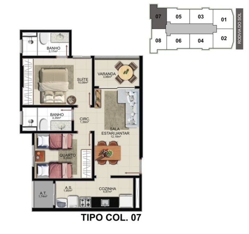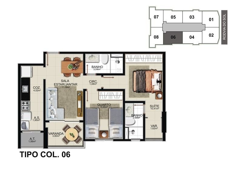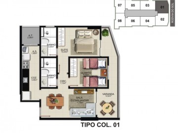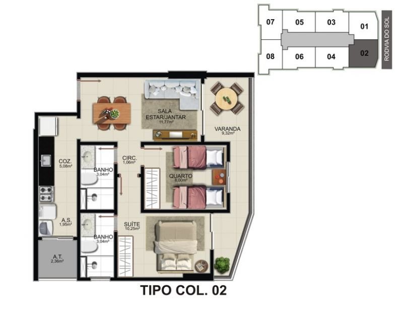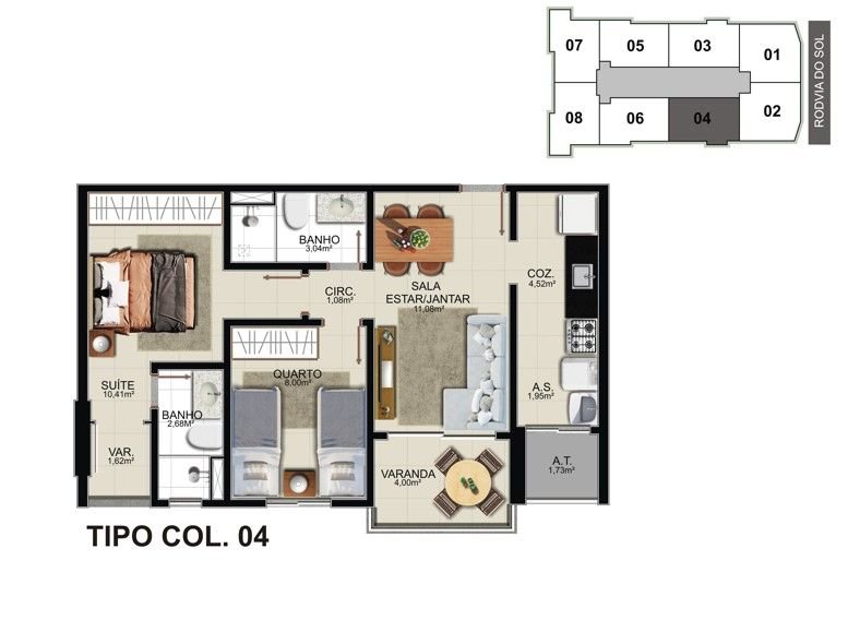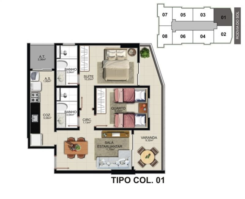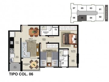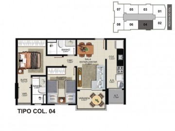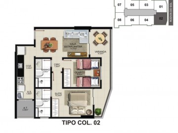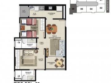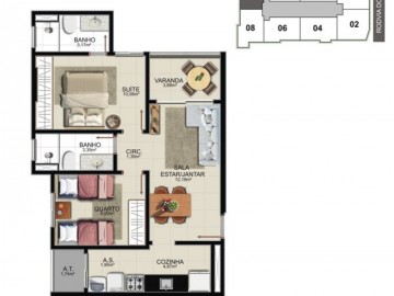 02 quartos c/ suíte e 01 ou 02 vagas de garagem. Plantas de 57,85m² a 64,39m² de área privativa.