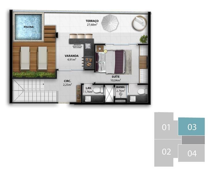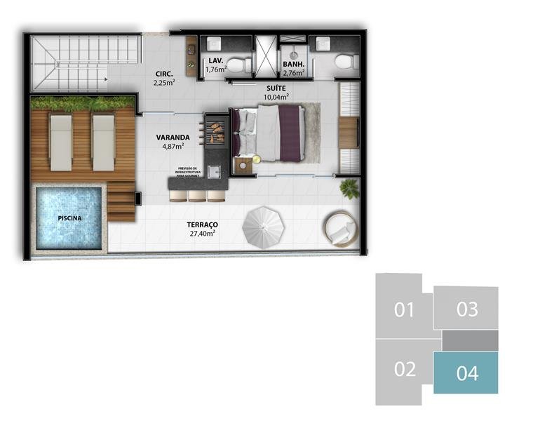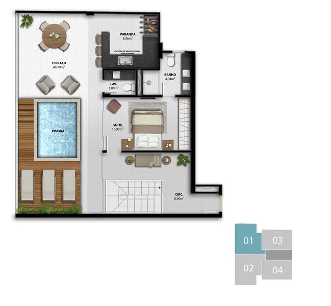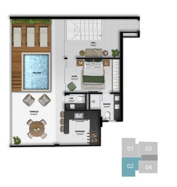 - Duplex 4 Suítes: 167,33 m2 privativos Coluna 1 /  168,49 m2 privativos Coluna 2