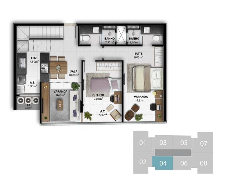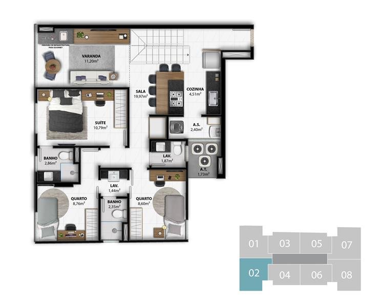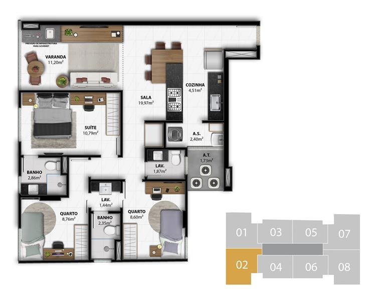 - Garden 2 Quartos 1 Suíte 100,64 m2 privativos Coluna 4 / 100,02 m2 privativos Coluna 5 / 101,27 m2 privativos Coluna 6 > localizado no 3º Pavimento