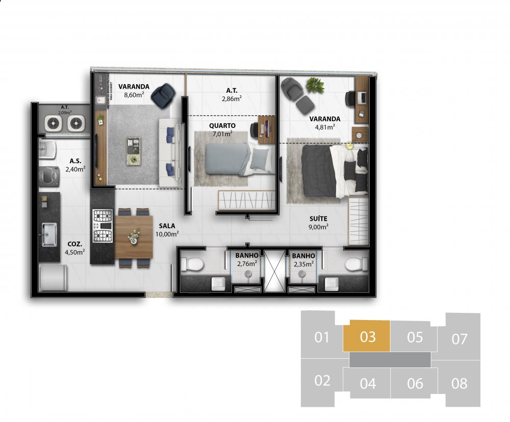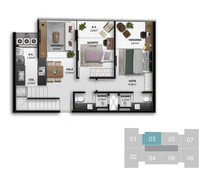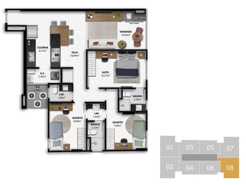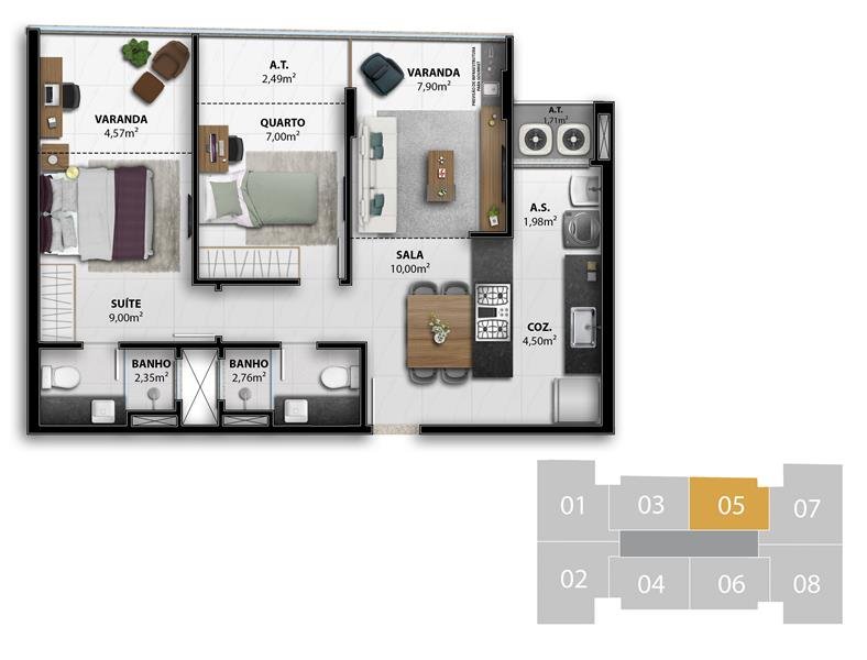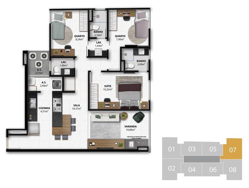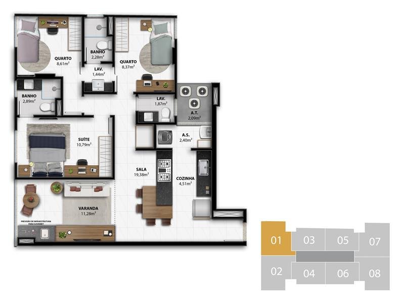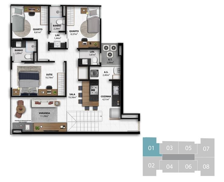 - 3 Suítes Colunas 1, 2, 7 e 8 do 4º ao 7º Pavimento 84,56 m2 privativos Coluna 1 / 84,84 m2 privativos Coluna 2 / 82,07 m2 privativos Coluna 7 / 81,80 m2 privativos Coluna 8