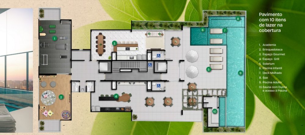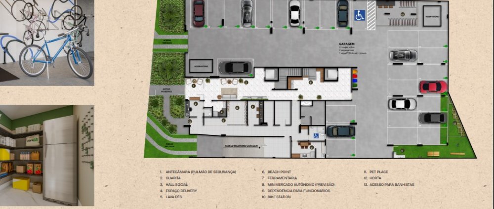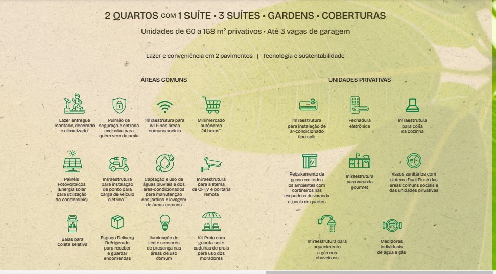 ÁREAS COMUNS: Infraestrutura para wi-fi nas áreas comuns sociais - Captação e uso de águas pluviais e dos ares-condicionados para manutenção dos jardins e lavagem de áreas comuns - Baias para coleta seletiva - Painéis Fotovoltaicos (Energia solar para utilização do condomínio) - Lazer entregue montado, decorado e climatizado* Kit Praia com guarda-sol e cadeiras de praia para uso dos moradores - Minimercado autônomo 24 horas - nfraestrutura para instalação de ponto para carga de veículo elétrico