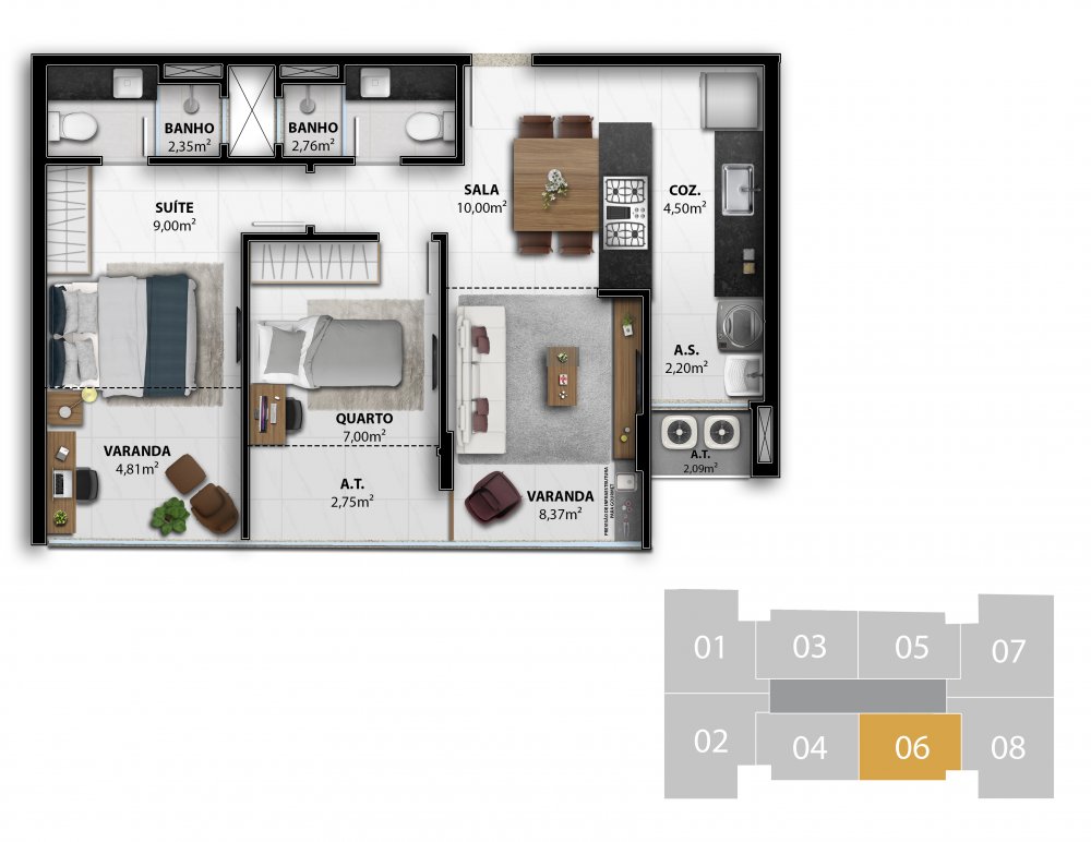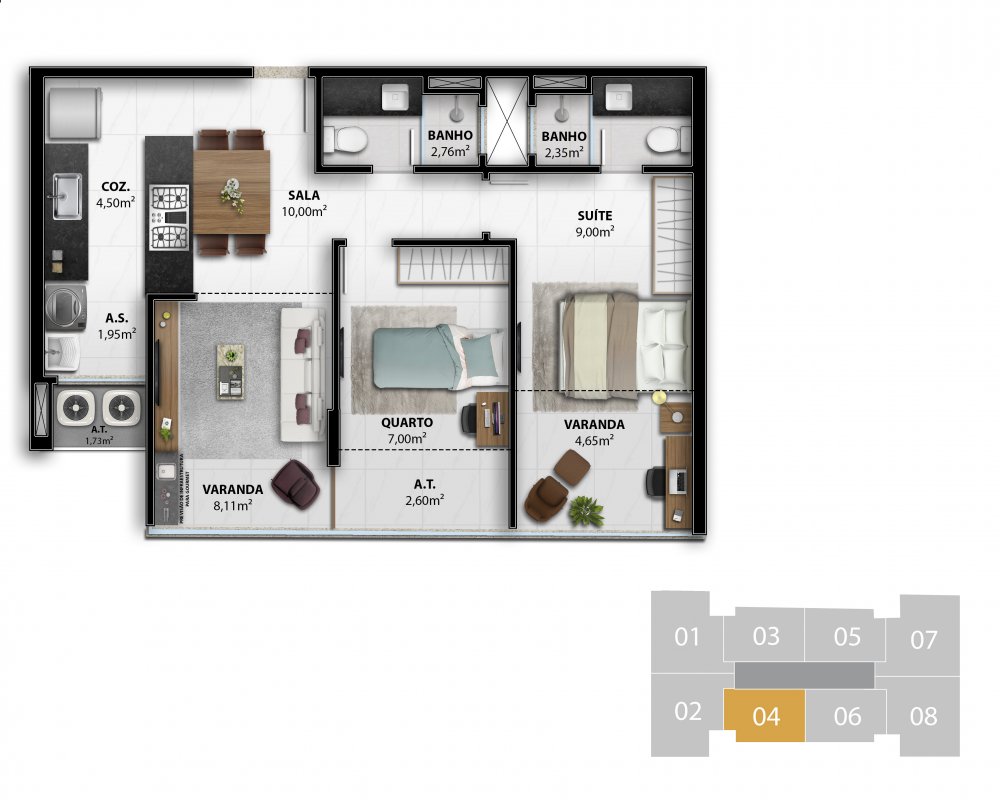 - 2 Quartos 1 Suíte 60,47 m2 privativos Coluna 4 / 60,00 m2 privativos Coluna 5 / 61,49 m2 privativos Coluna 6 > do 4° ao 7° pavimento
