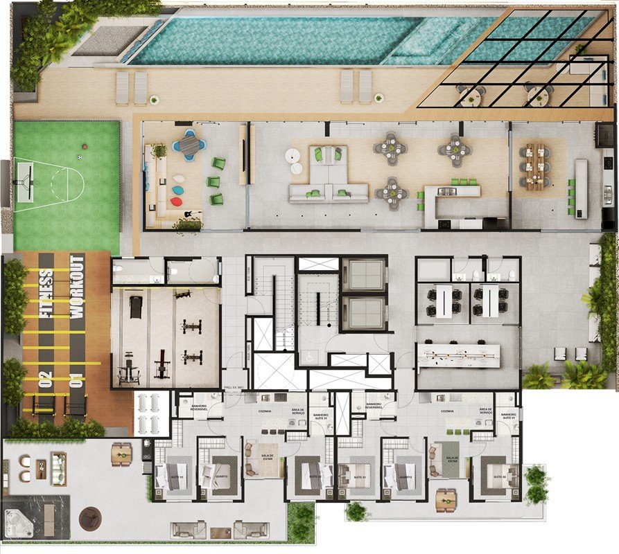 - 03 quartos (sendo 01 suíte) contemplado com 01 ou 02 vagas na garagem.