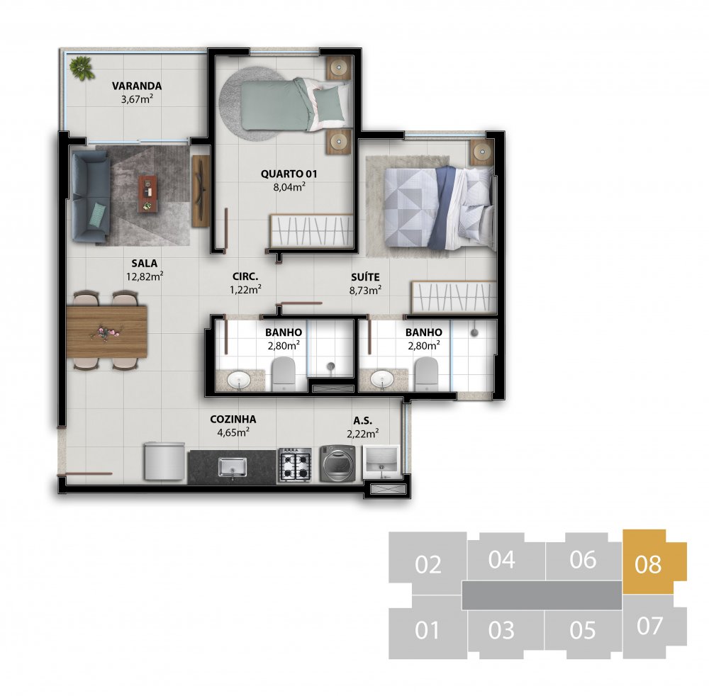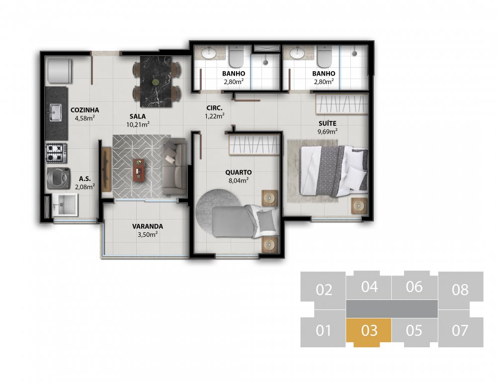 COLUNA 08 - APARTAMENTO 2 QUARTOS C/ SUÍTE 53,48 m²