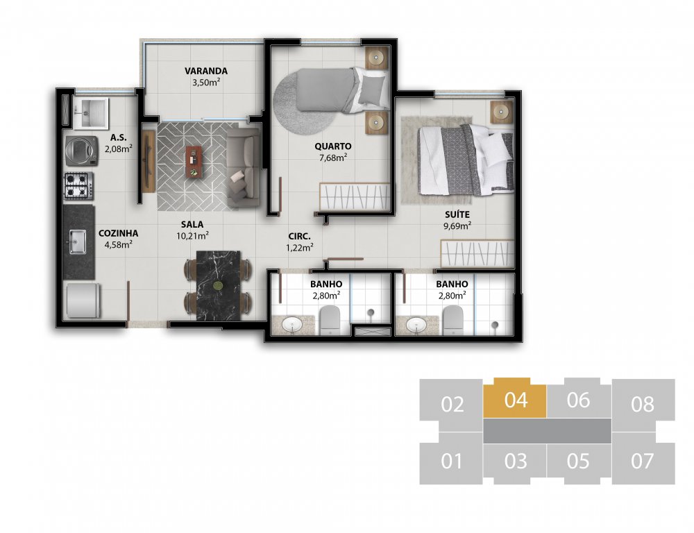 COLUNA 04 - APARTAMENTO 2 QUARTOS C/ SUÍTE 51,07 m²