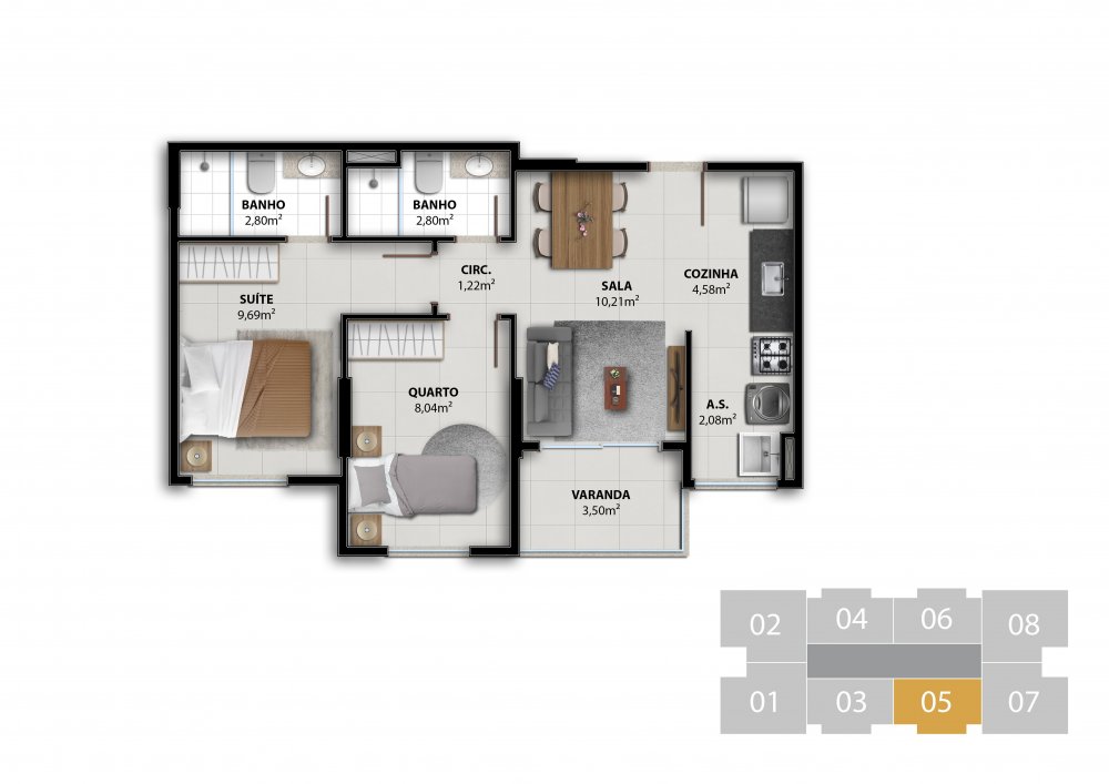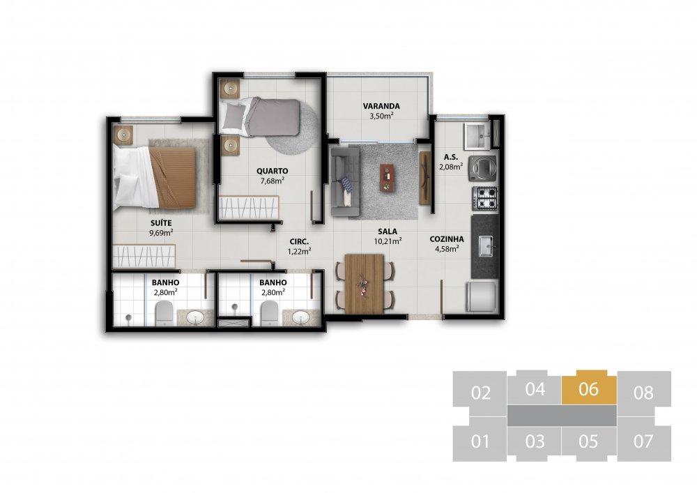 COLUNA 06 - APARTAMENTO 2 QUARTOS C/ SUÍTE 51,07 m²