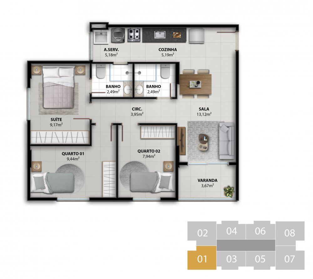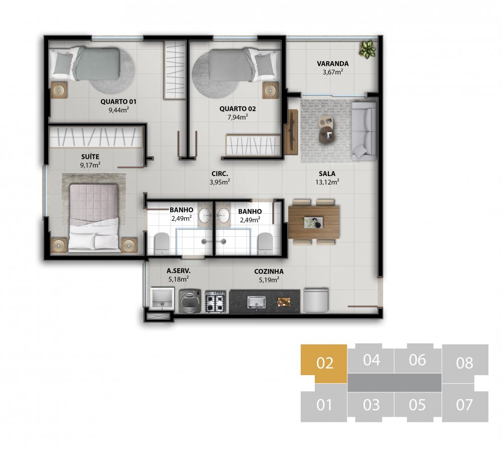 COLUNA 02 - APARTAMENTO 3 QUARTOS C/ SUÍTE 67,16 m²