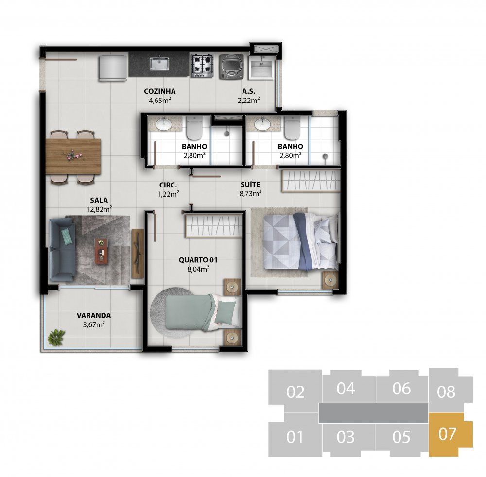 COLUNA 07 - APARTAMENTO 2 QUARTOS C/ SUÍTE 53,48 m²