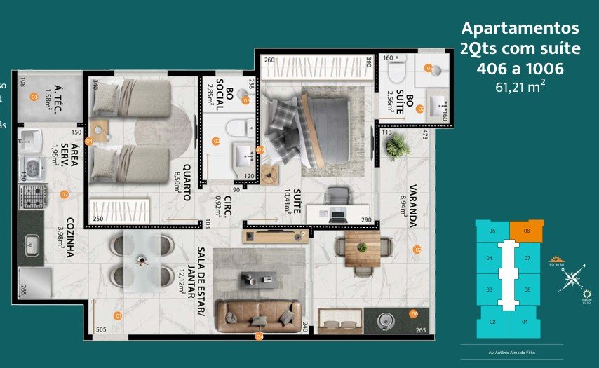 - Coluna 06 > dois quartos com 61,21m²
