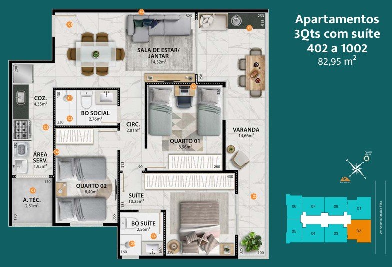 - Colunas 1 e 2 > três quartos com 82,95 m2