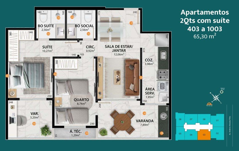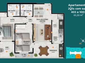 - Coluna 03 > dois quartos com 65,30m²