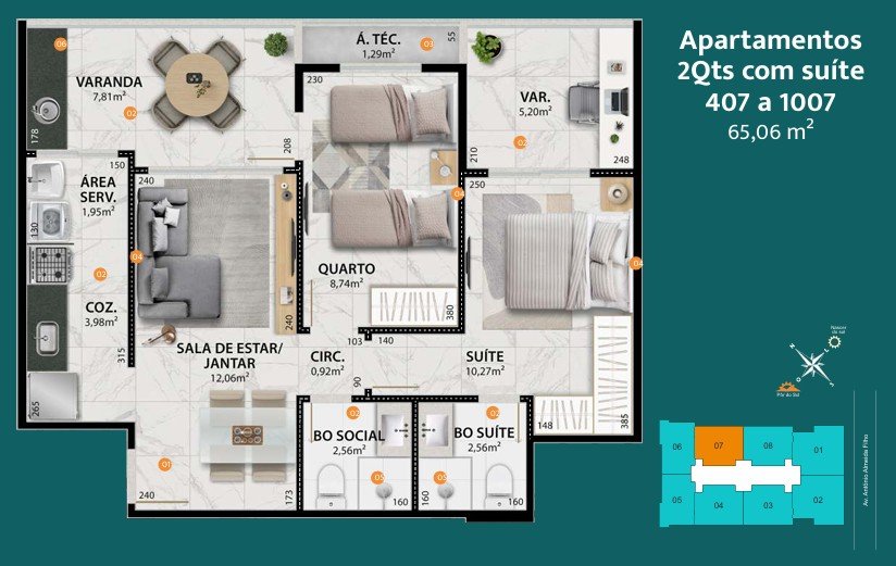 - Coluna 07 > dois quartos com 65,06m²