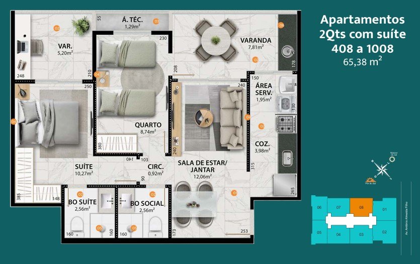 - Coluna 08 > dois quartos com 65,38m