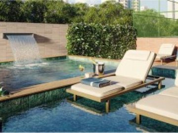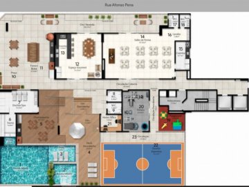 Pilotis: Piscina adulto, piscina infantil, praia, deck descoberto, churrasqueira, sauna com acesso a piscina, duchas/spa, banheiro feminino, banheiro masculino, praça, espaço brasa, espaço gourmet com cozinha, salão de festas com cozinha, lavabo, banheiro masculino e banheiro feminino. Playground, fitness, home office, quadra esportiva e circulações.