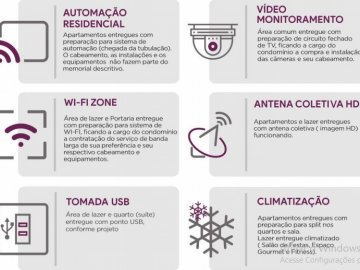A área de lazer, com mais de 930 m² , será entregue montada e decorada. Salão de festas, espaço gourmet e fitness serão climatizados. Outros destaques ficam por conta de: piscinas adulto e infantil, deck, sauna com acesso à piscina, praças das mães e da música, churrasqueiras, playground, quadra esportiva e praça gourmet.